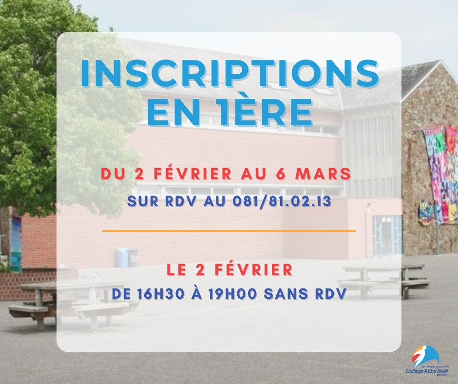 Les inscriptions des futurs élèves de 1ère recommencent le lundi 14 avril, uniquement sur rendez-vous. 081/81.02.10